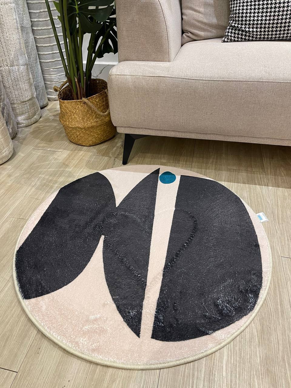 Round 0.8m polyester carpet in a minimalistic pattern.