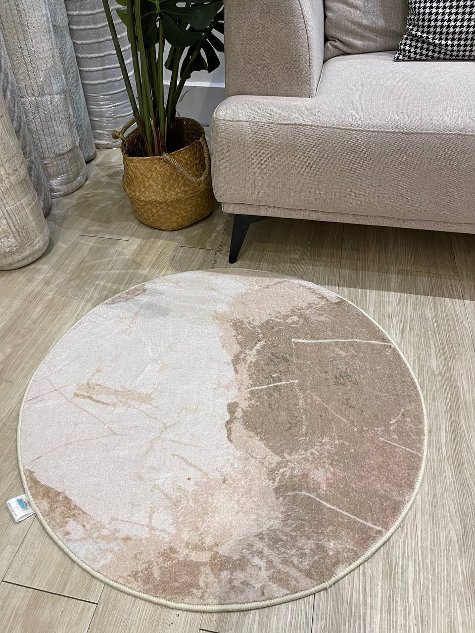 Round polyester carpet with traditional motifs, 0.8m diameter.